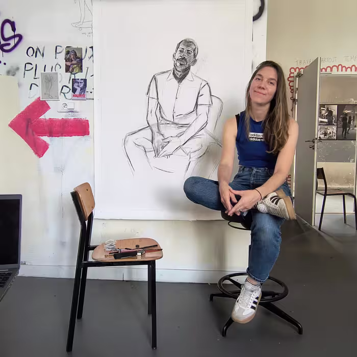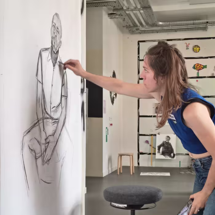 Les portraits sont des dessins en grands formats réalisés au fusain et à la pierre noire. Ils manifestent un souci de réalisme qui répond au besoin de valorisation de l’image de chacun.e. Pour autant, ils vont plus loin que le seul visage représenté pour aller toucher à l’intériorité même des personnes. A travers chaque dessin se cache une histoire, qui se dévoile si on prête attention aux regards, aux gestuelles et aux objets. Les dessins jouent sur la mise en scène de soi en ayant recours à un cadrage qui évoque une focale photographique. Ici, ce sont les personnes qui choisissent leur pose et qui décident ce qu’elles souhaitent bien rendre public.